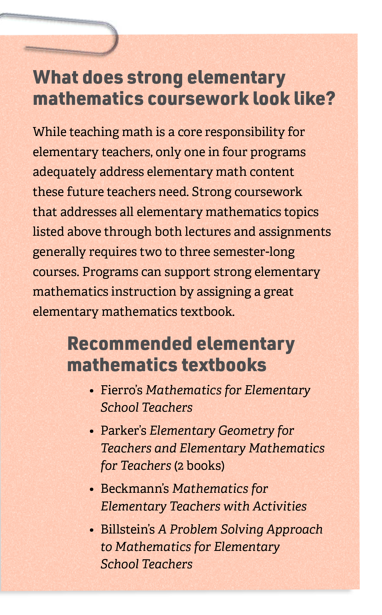 In most cases, teacher prep programs can establish parameters that will guide teacher candidates to select courses that both fulfill the institutions' general education requirements and best prepare them for an elementary teaching career. If institutions review available coursework in light of its attainability, breadth, relevance, and focus on content, they can identify coursework that is better aligned with the needs of an aspiring elementary teacher. A sure foundation in elementary content will likely lead to better outcomes for all: better licensure pass rates, better retention in the profession and, finally, better content delivery and mastery for elementary students.